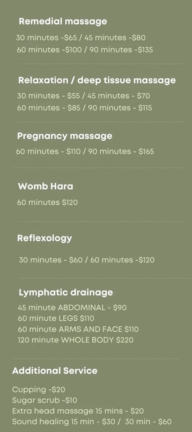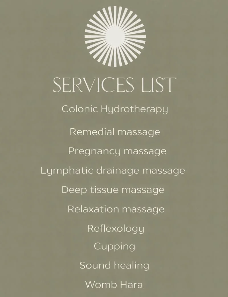 Below are the massage services we offer and pricing. To book a massage please contact me directly. To book a colonic hydrotherapy session you can use our online booking system.